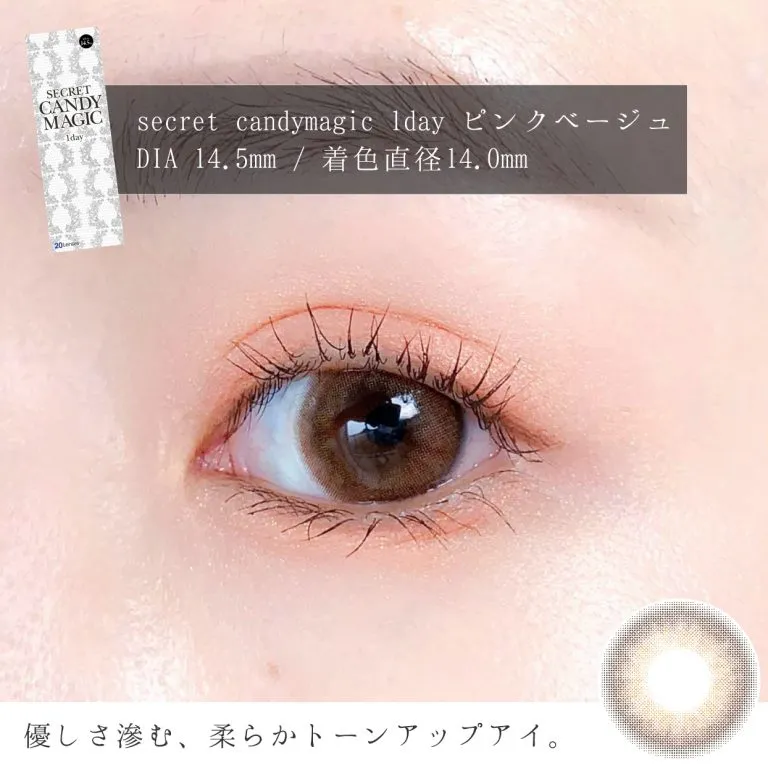 secret candymagic 1day(シークレット キャンディーマジック ワンデー)ピンクベージュは、柔らかカラーで抜け感たっぷりのブラウンカラコン。