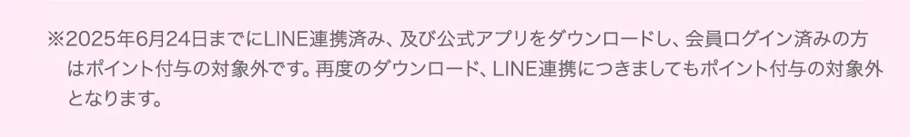 - ※2025年6月24日までにLINE連携済み、及び公式アプリをダウンロードし、会員ログイン済みの方はポイント付与の対象外です。再度のダウンロード、LINE連携につきましてもポイント付与の対象外となります。