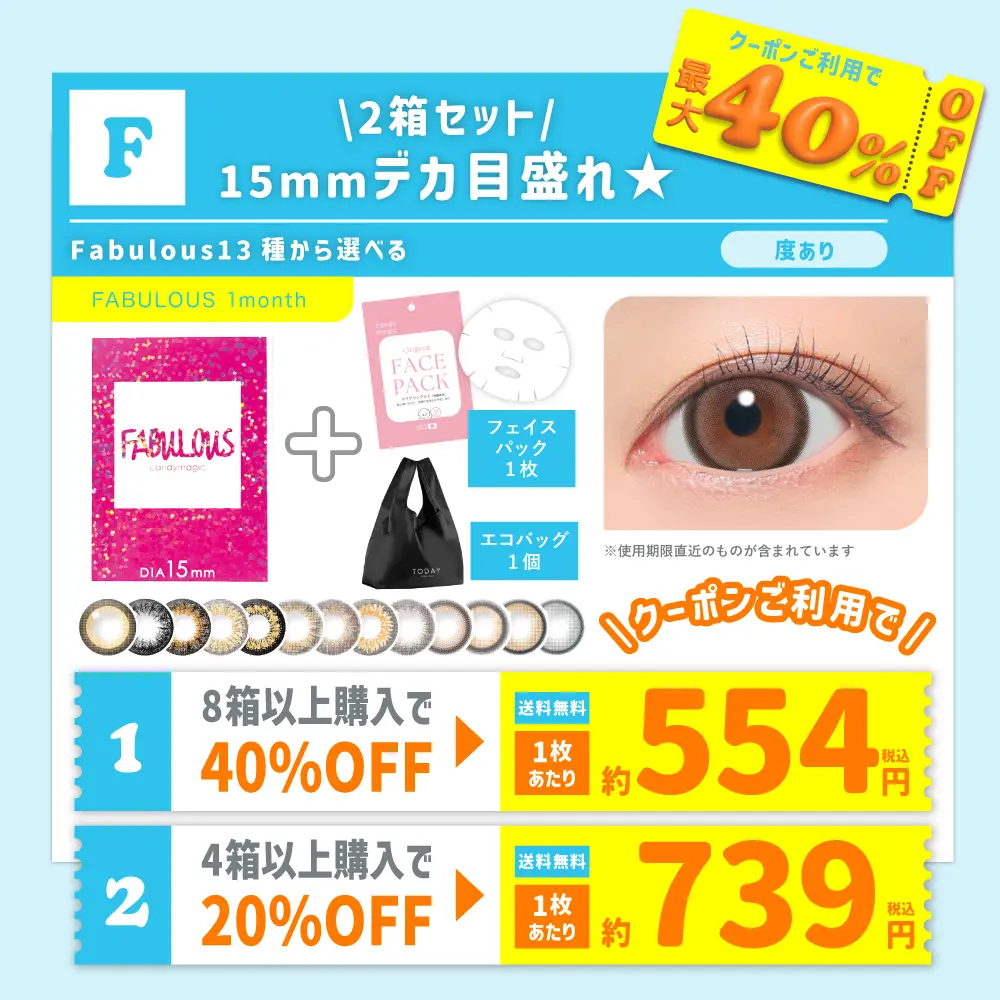【F】 <クーポンご利用で最大40%OFF>15mmデカ目盛れ★Fabulous13種から選べる マンスリー 度あり (1箱1枚×2箱セット) フェイスパック+エコバッグ付 【送料無料】